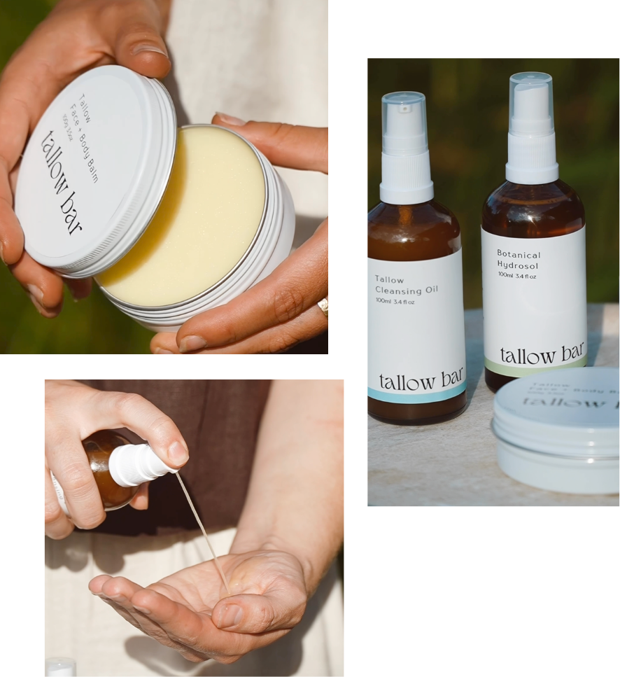 The cleansing oil gently removes impurities, the hydrosol hydrates and prepares the skin, and the tallow balm seals in moisture and supports the skin barrier.